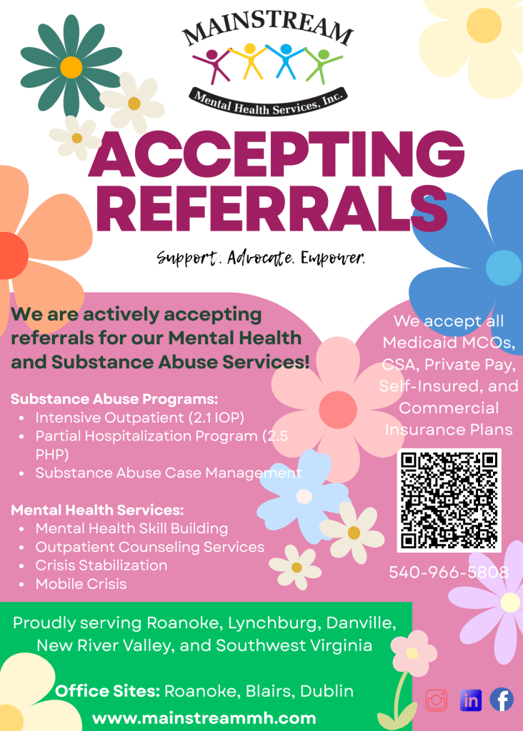 With a collective commitment to both mental health and substance abuse services across the Roanoke Valley, New River Valley, SWVA, and Southside VA; Mainstream Mental Health Services brings together individuals who share a common goal: supporting, advocating, and empowering others.